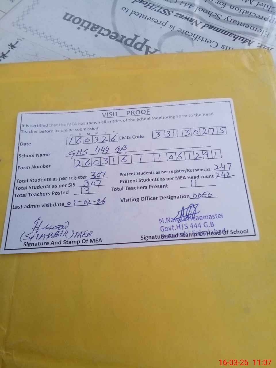 | Attendance Register | Head Teacher | MEA with School | Visit Proof |
