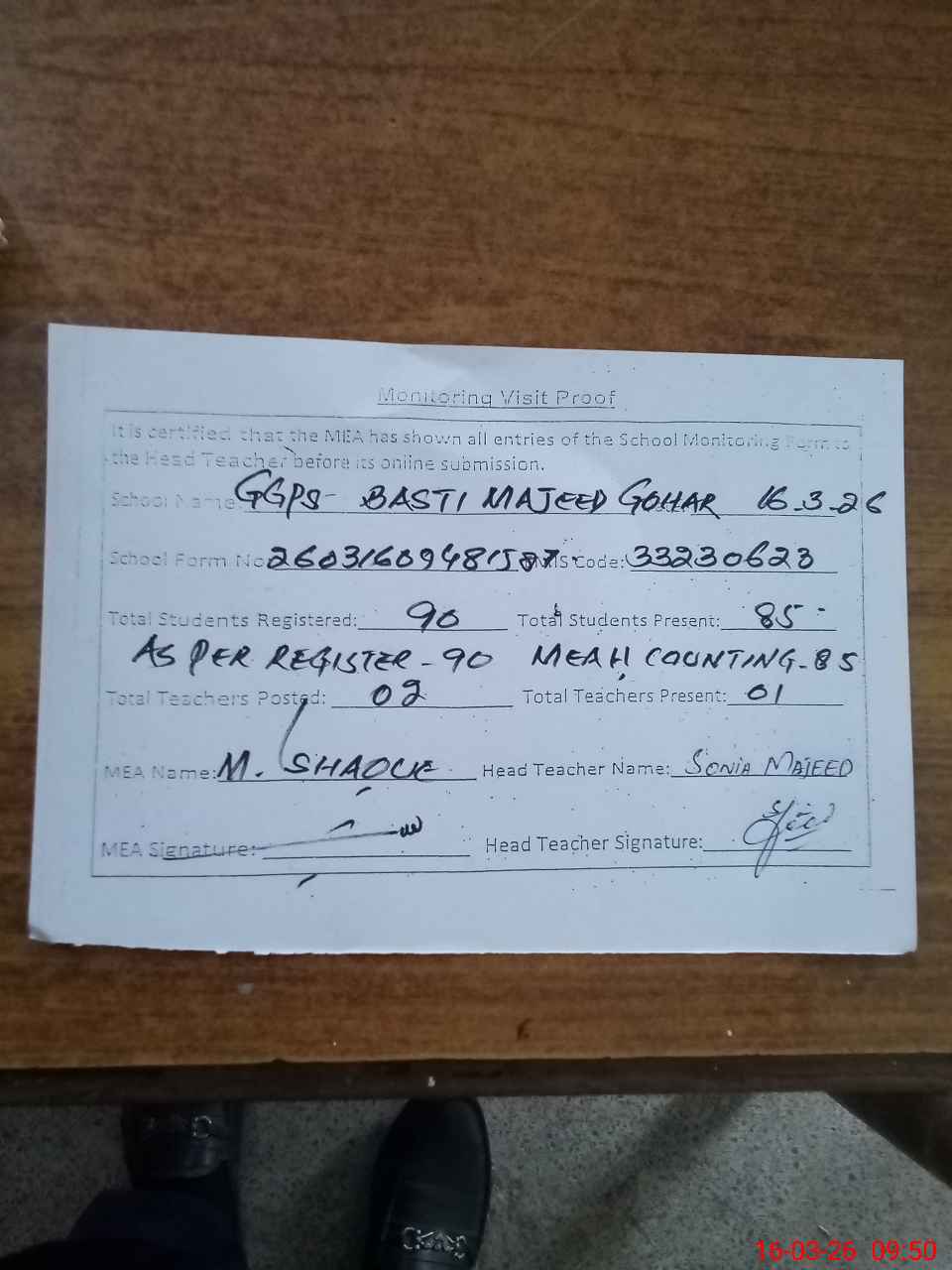 | EMIS Code: 33230623 | Name of School: GGPS BASTI MAJEED GOHAR | |||