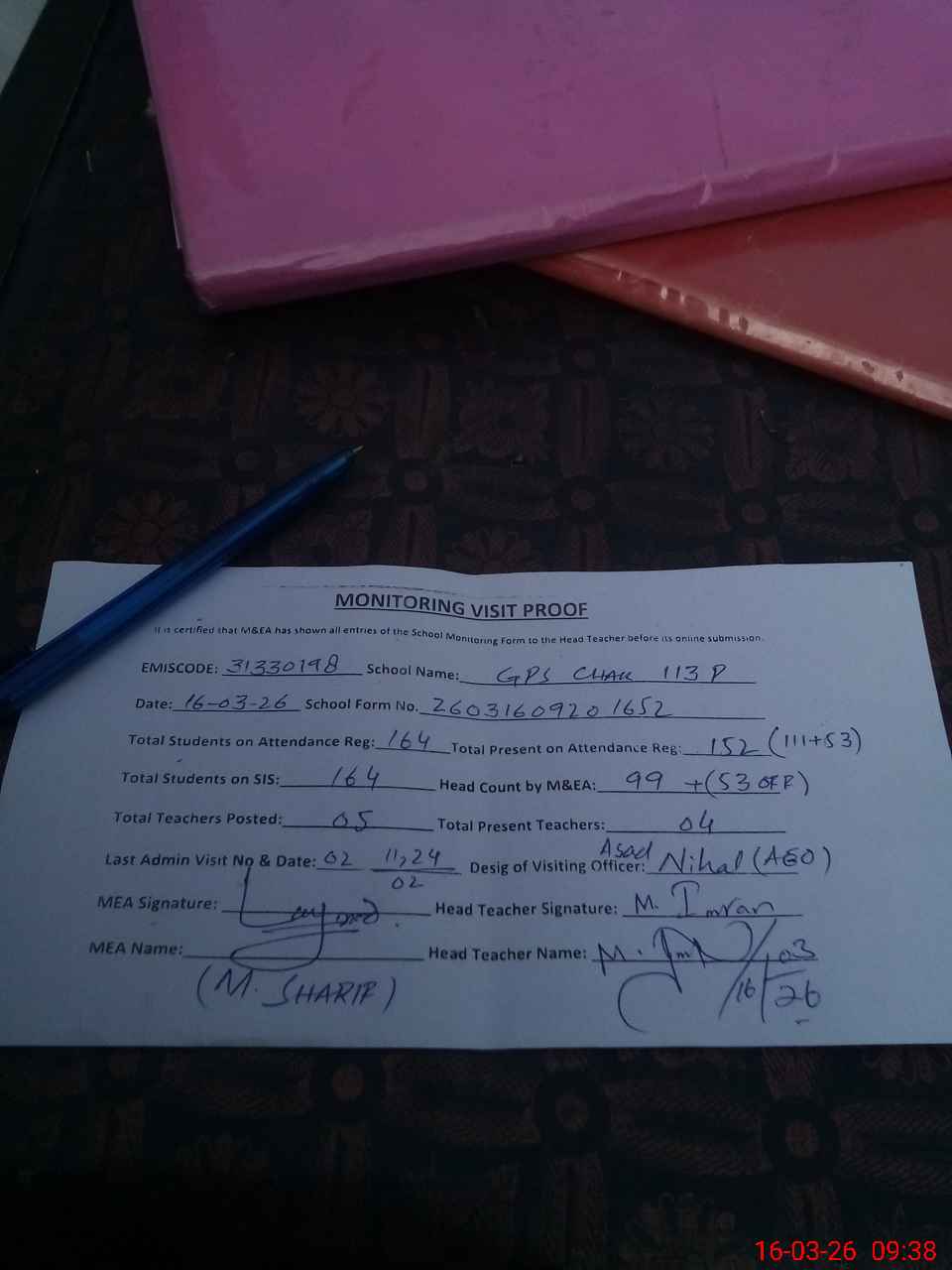 | EMIS Code: 31330198 | Name of School: GPS CHAK NO. 113/P | |||