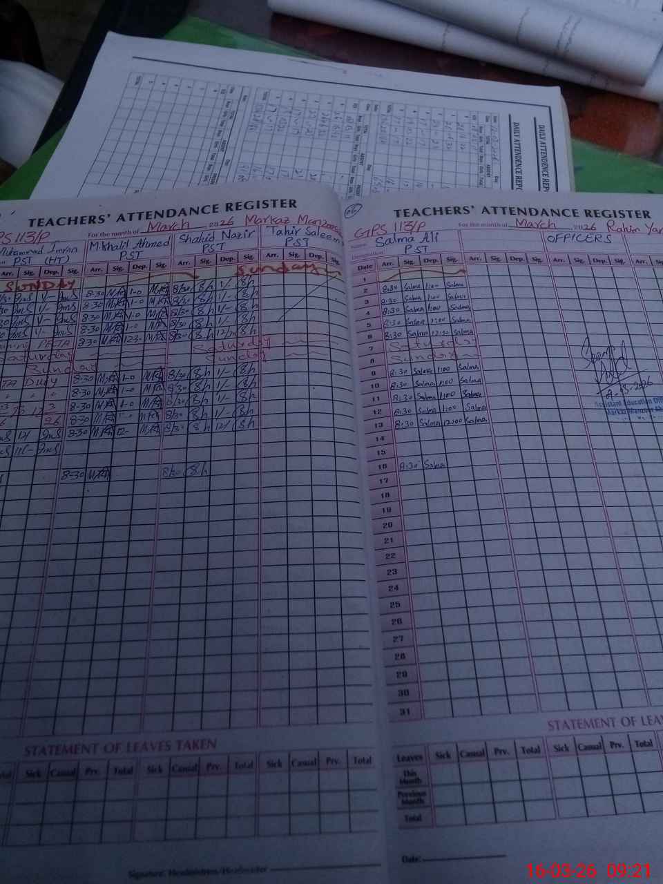 | Remarks (Use Separate Page if Required): Classes on OFF = ECCE+ nursery Students on OFF= 53 Students schd for SBA= 111 Present for the SBA=. 99 NSB record not found barbed wire not available Old building 03 classroom repair needed. 01 classroom with out roofing other 02 also repair needed | |||||