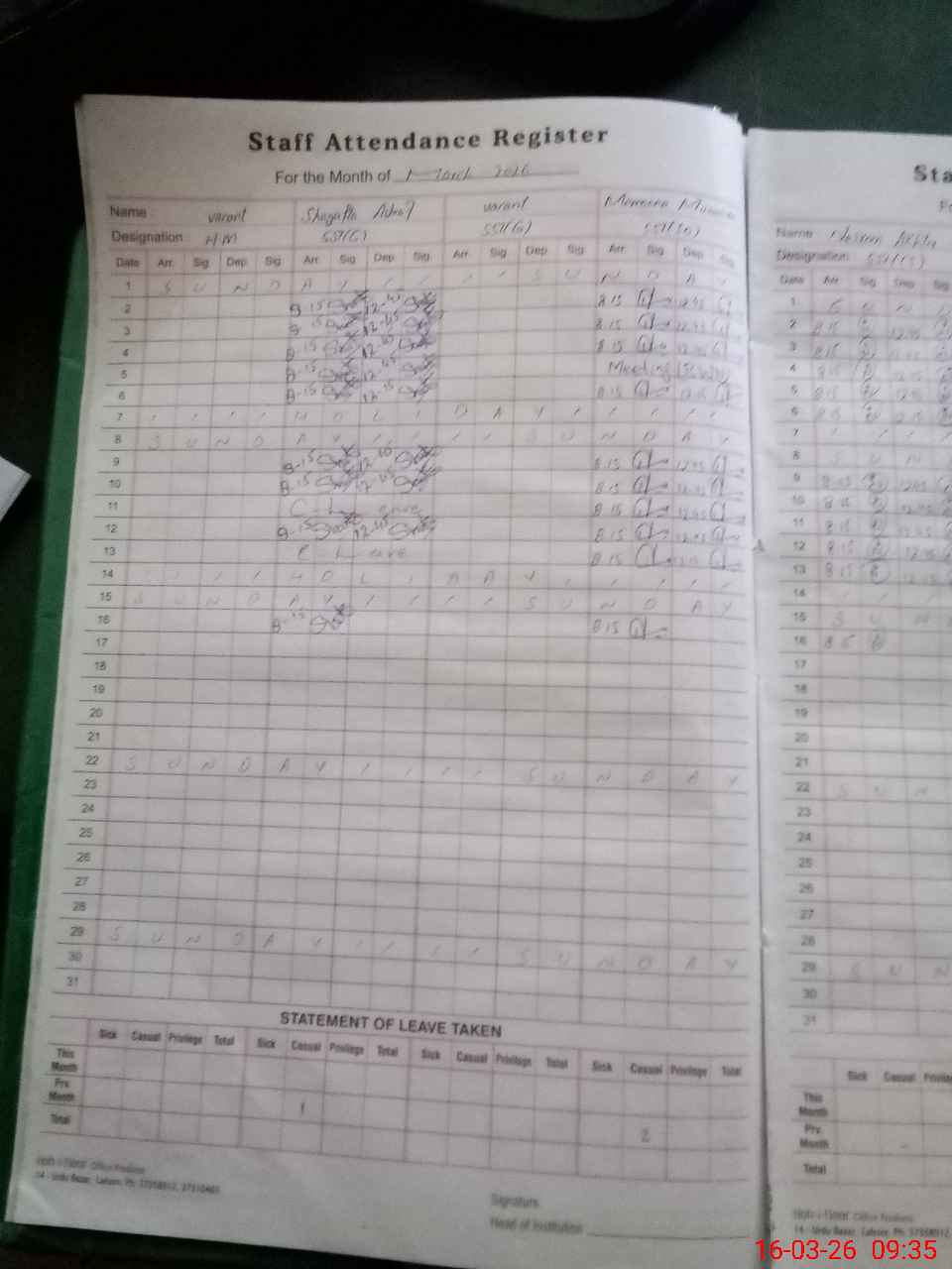 | Leave | Duty | Absent | Maternity | Medical | Ex- Pak |