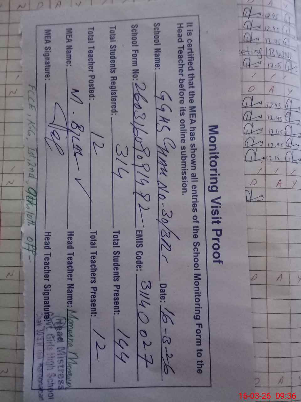 | Attendance Register | Head Teacher | MEA with School | Visit Proof |