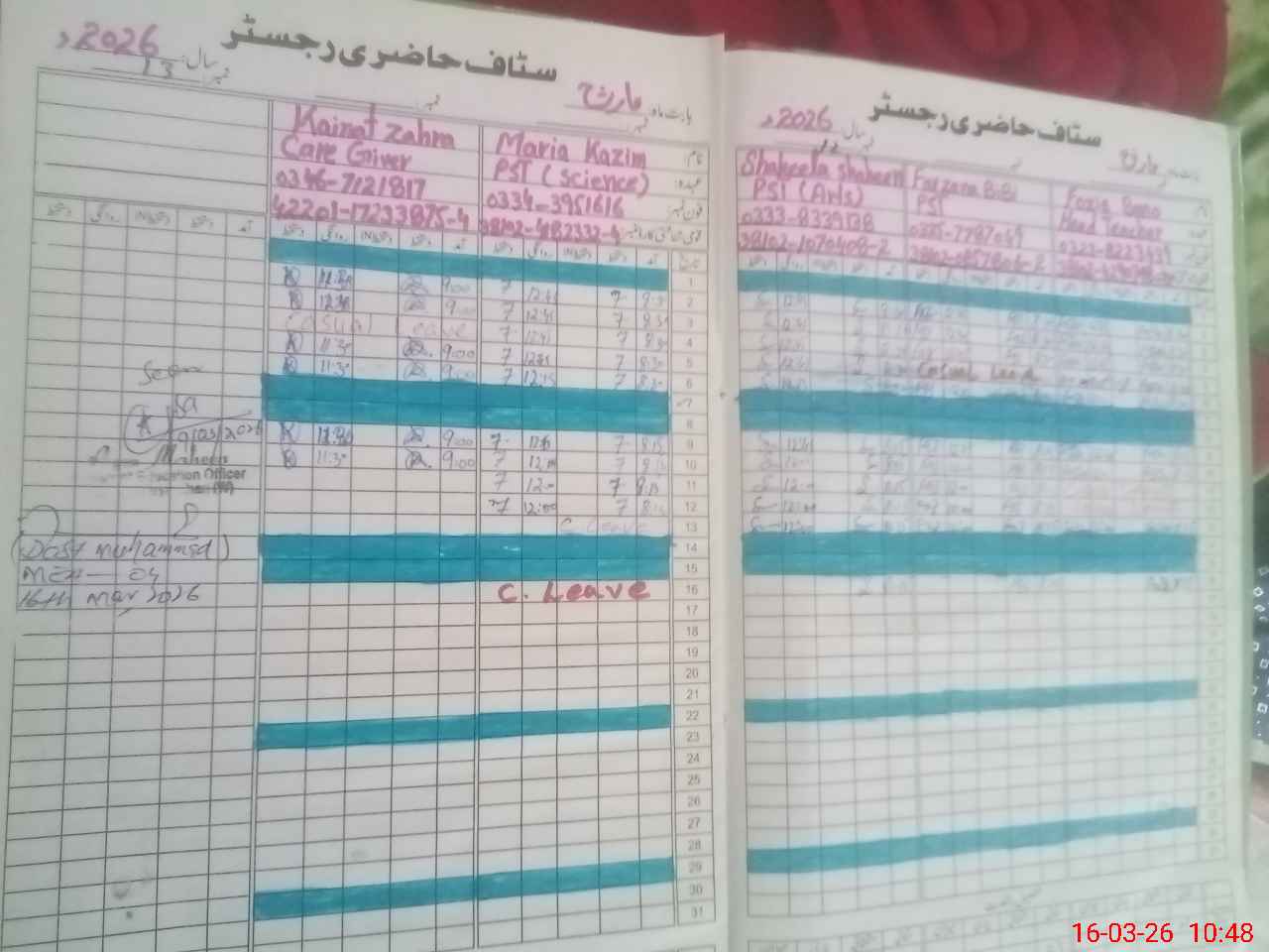 | Leave | Duty | Absent | Maternity | Medical | Ex- Pak |