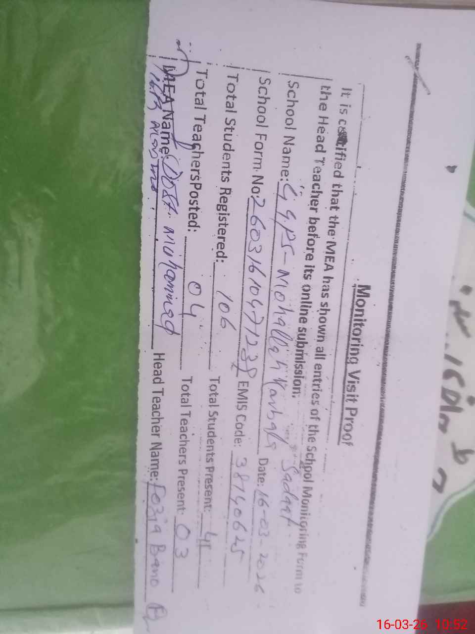 | Remarks (Use Separate Page if Required): All the entered data loudly share with the head teacher before submitting NSB Record not maintained properly ECCE and Nursery classes are not present (off) due to the current international situation after the decision of the Punjab Government | |||||