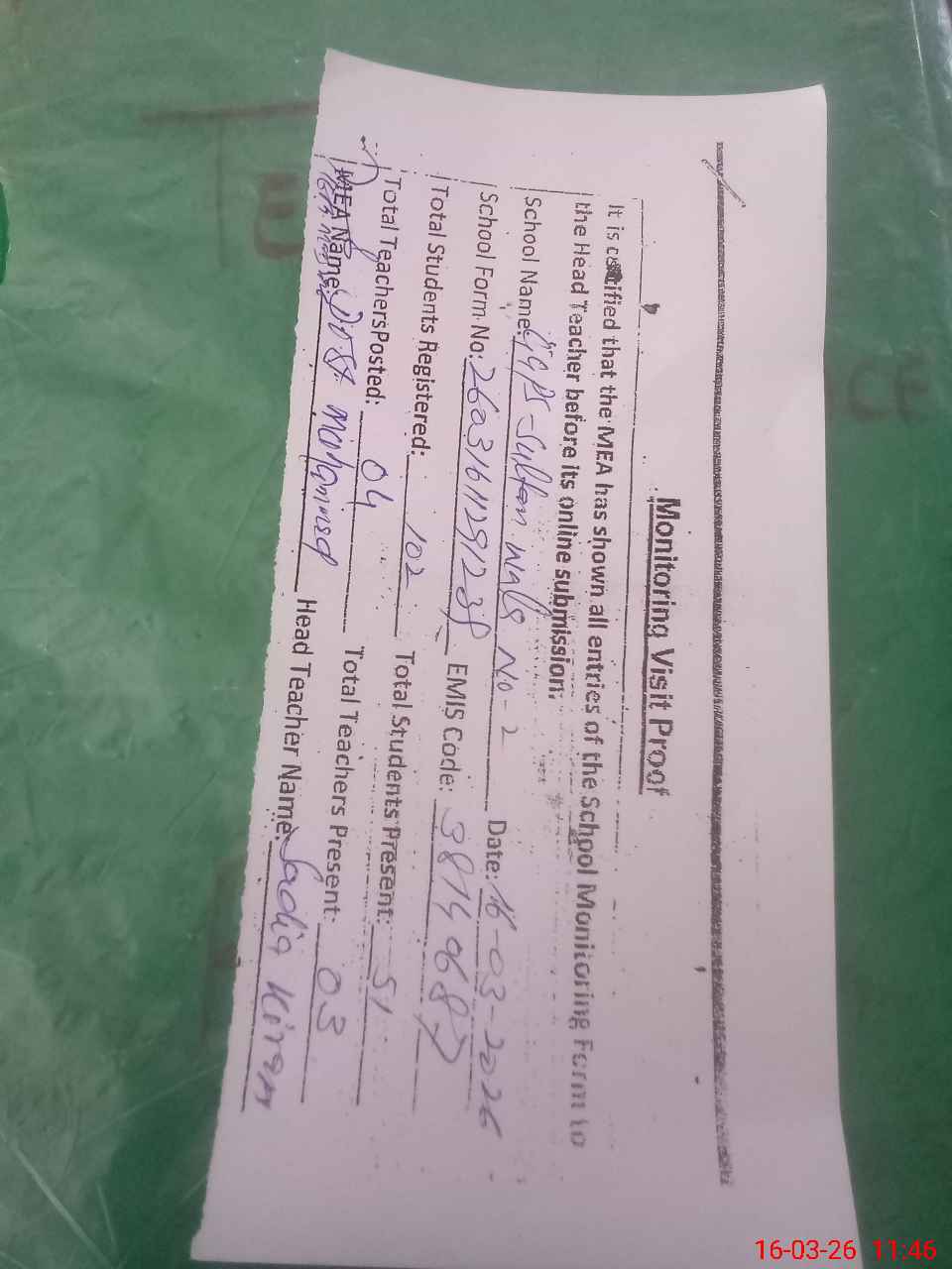 | Attendance Register | Head Teacher | MEA with School | Visit Proof |