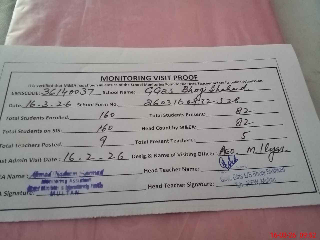 | Certified that this School was Inspected by the Undersigned MEA/DMO Today and the Information Stated Above is as Per Record. | |||||