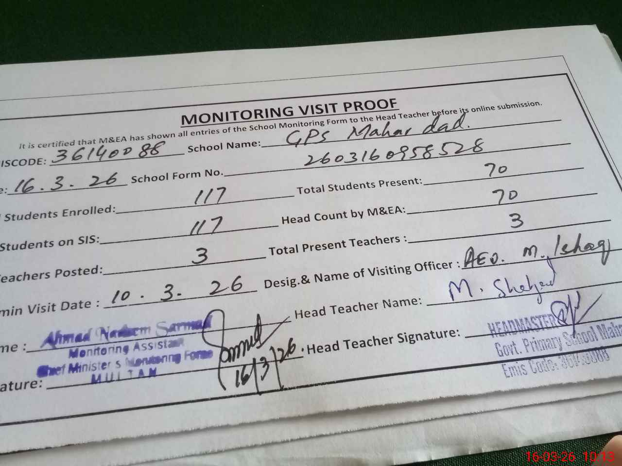 | Certified that this School was Inspected by the Undersigned MEA/DMO Today and the Information Stated Above is as Per Record. | |||||