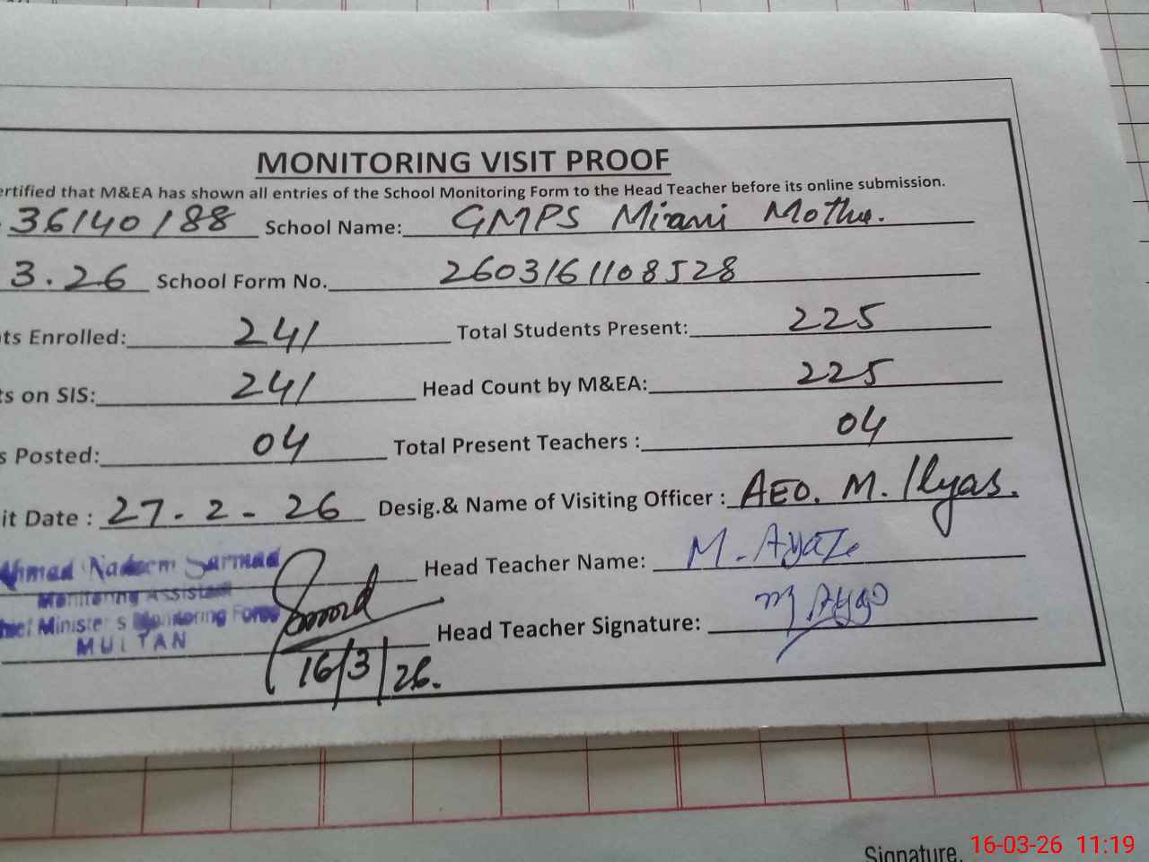 | Attendance Register | Head Teacher | MEA with School | Visit Proof |