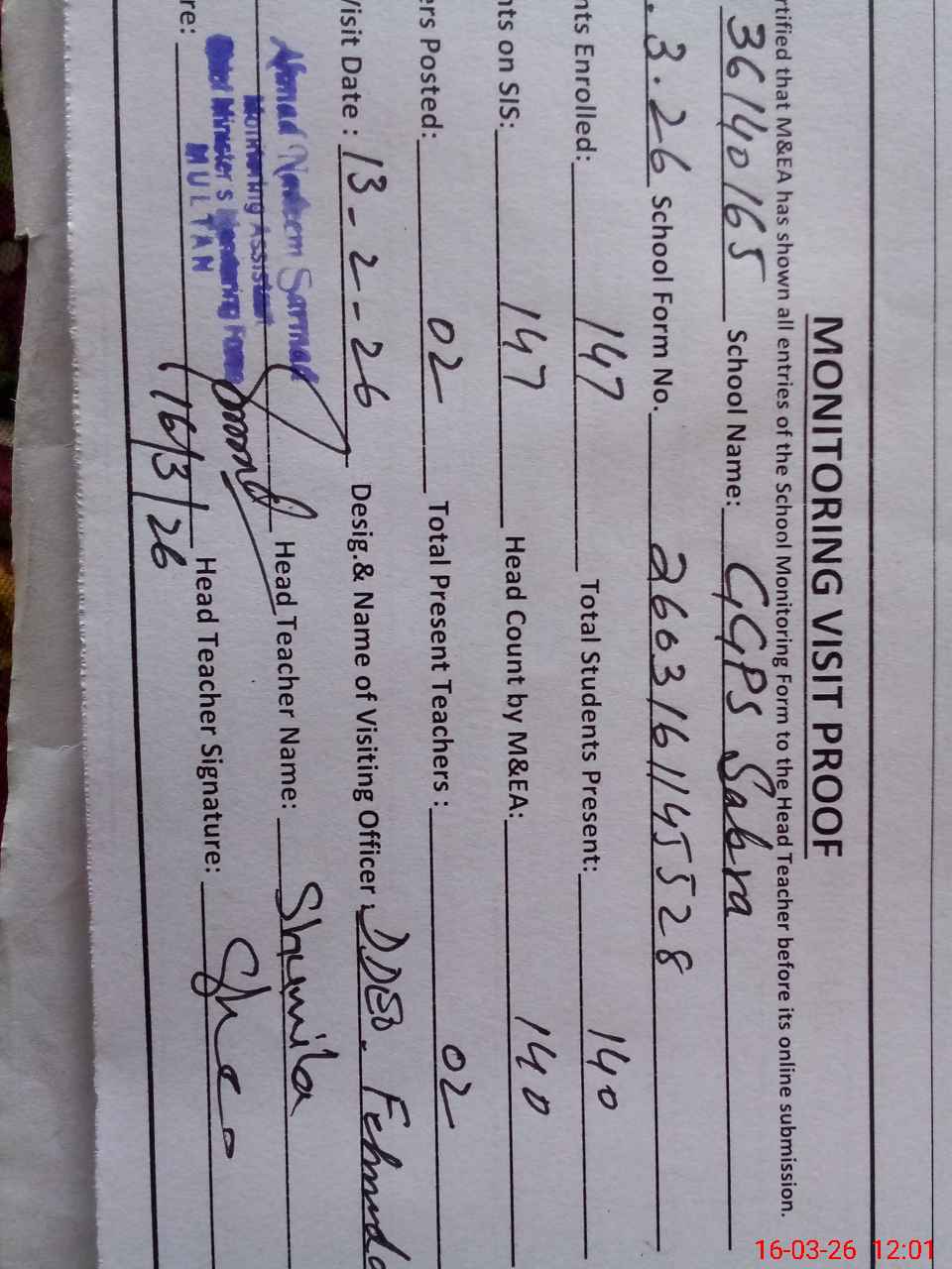 | Attendance Register | Head Teacher | MEA with School | Visit Proof |