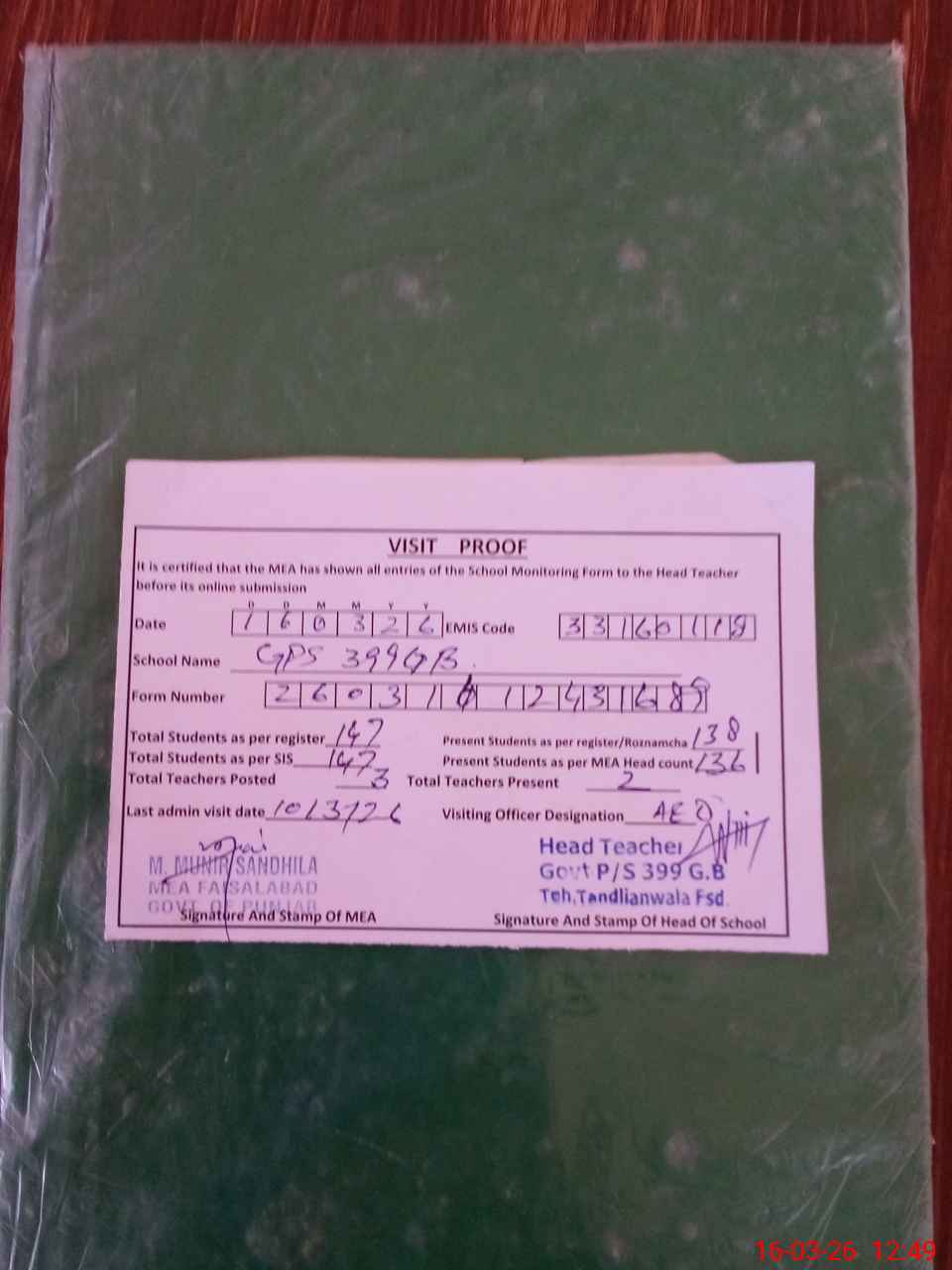| EMIS Code: 33160118 | Name of School: GPS CHAK 399 GB I TANDLIANWALA | |||