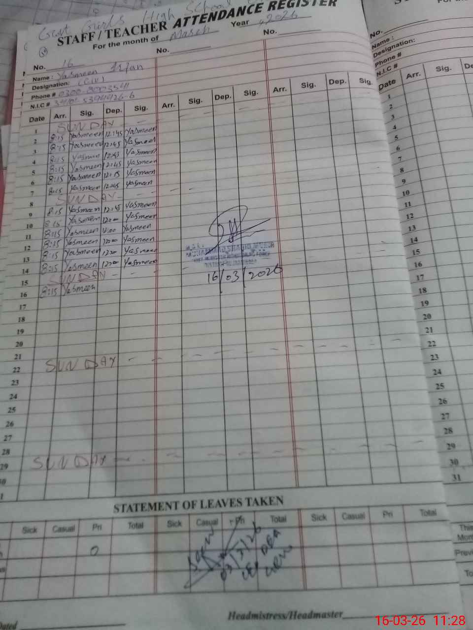 | CNIC | Full Name | Designation | R/C | Absence During Last Calender Month |