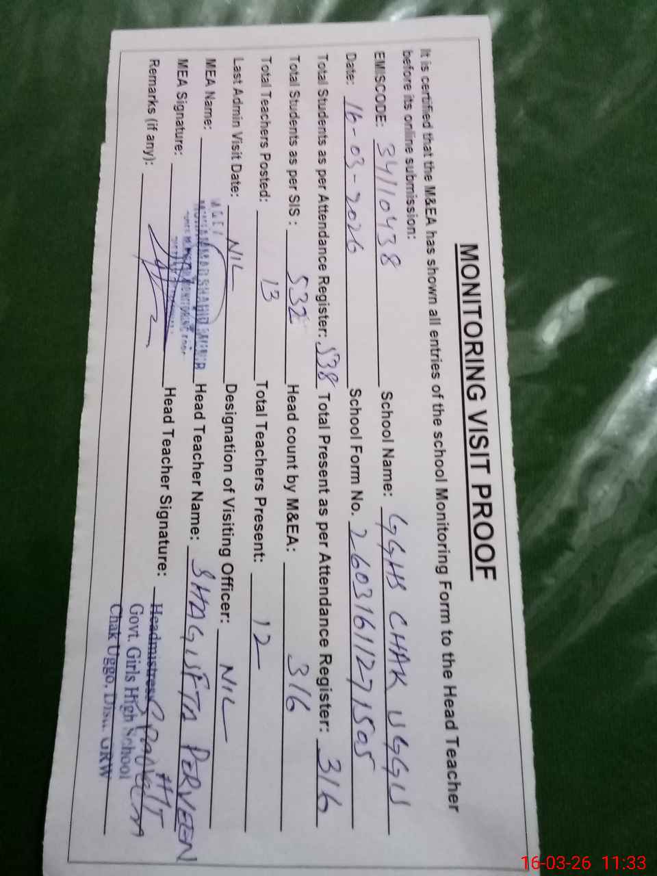| Attendance Register | Head Teacher | MEA with School | Visit Proof |