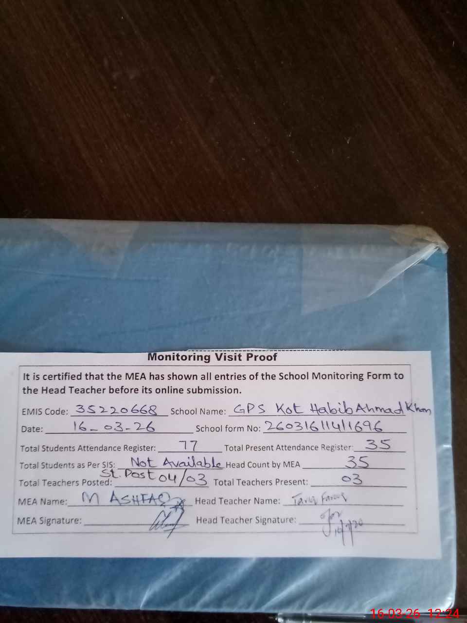 | Remarks (Use Separate Page if Required): Class Nursery on Off today and total students strength is 36 FTF Bank account not opened while it's amount is in hand Whole the school building is looking poor condition excluding toilets it's average condition. Renovation and paint work highly required NSB Bank statement missing AEO Muhammad Aamir last visited today dated 16-03-25 35220668 | |||||