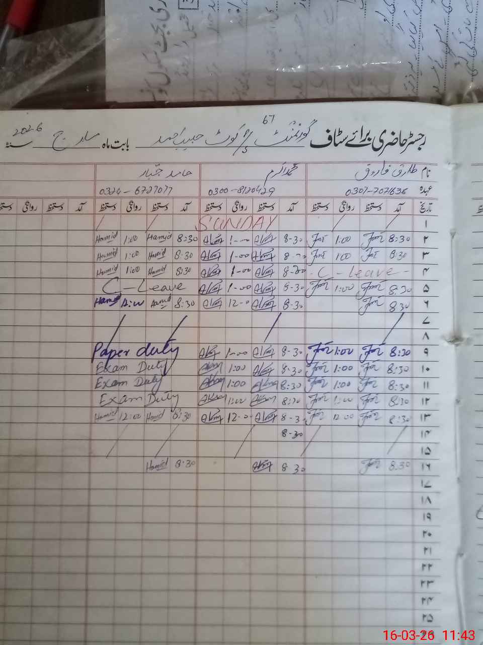 | CNIC | Full Name | Designation | R/C | Absence During Last Calender Month |