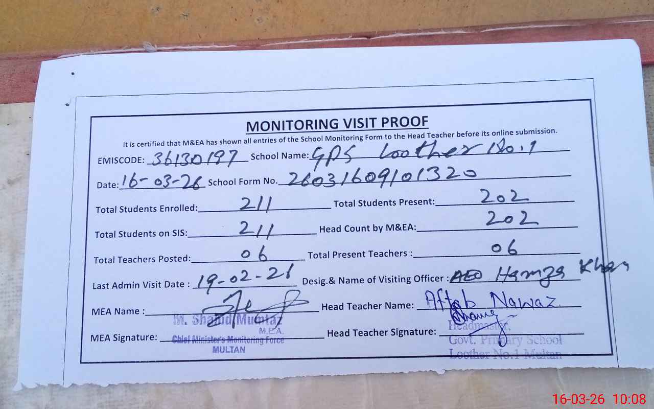 | Certified that this School was Inspected by the Undersigned MEA/DMO Today and the Information Stated Above is as Per Record. | |||||
