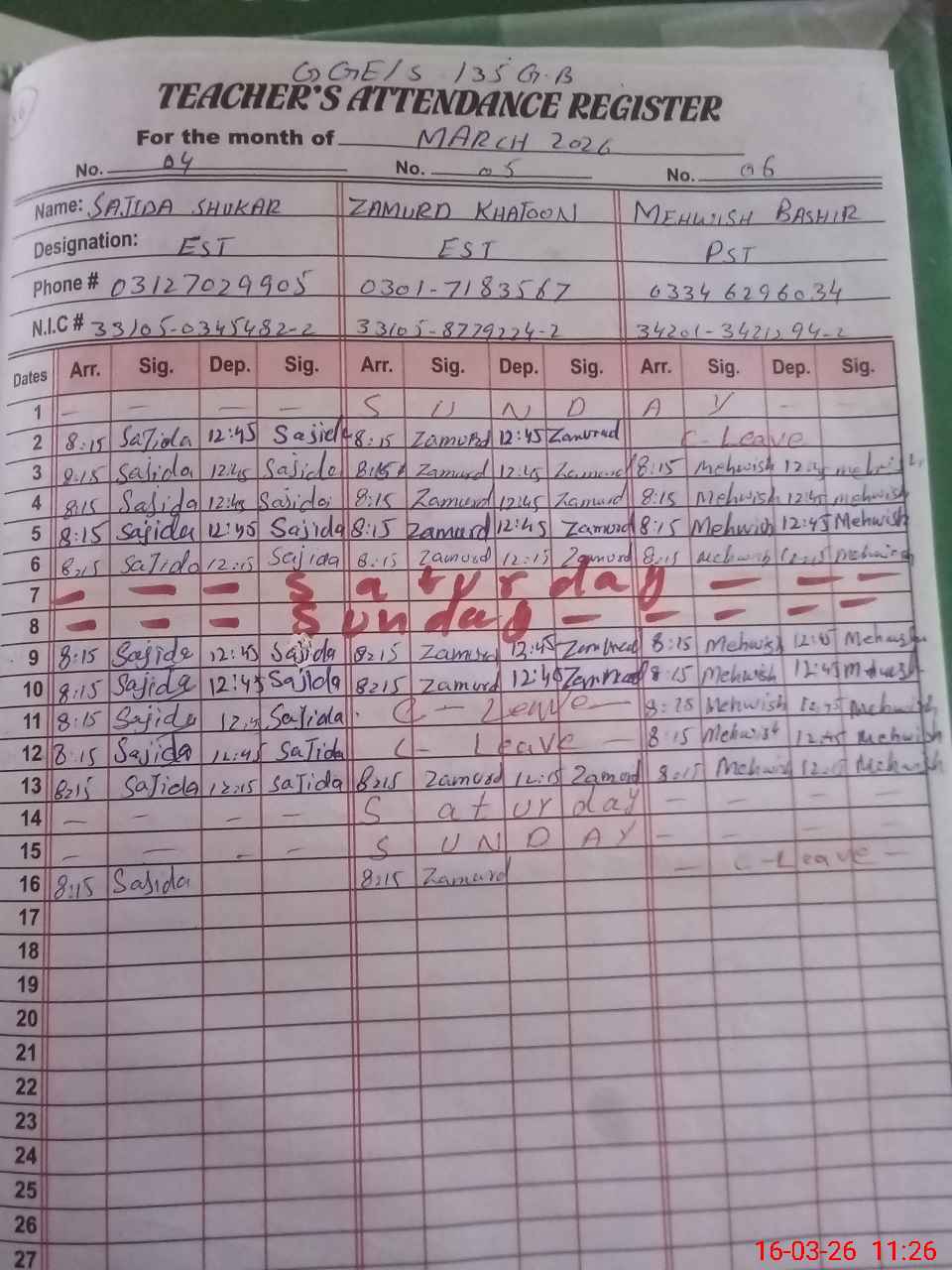 | CNIC | Full Name | Designation | R/C | Absence During Last Calender Month |