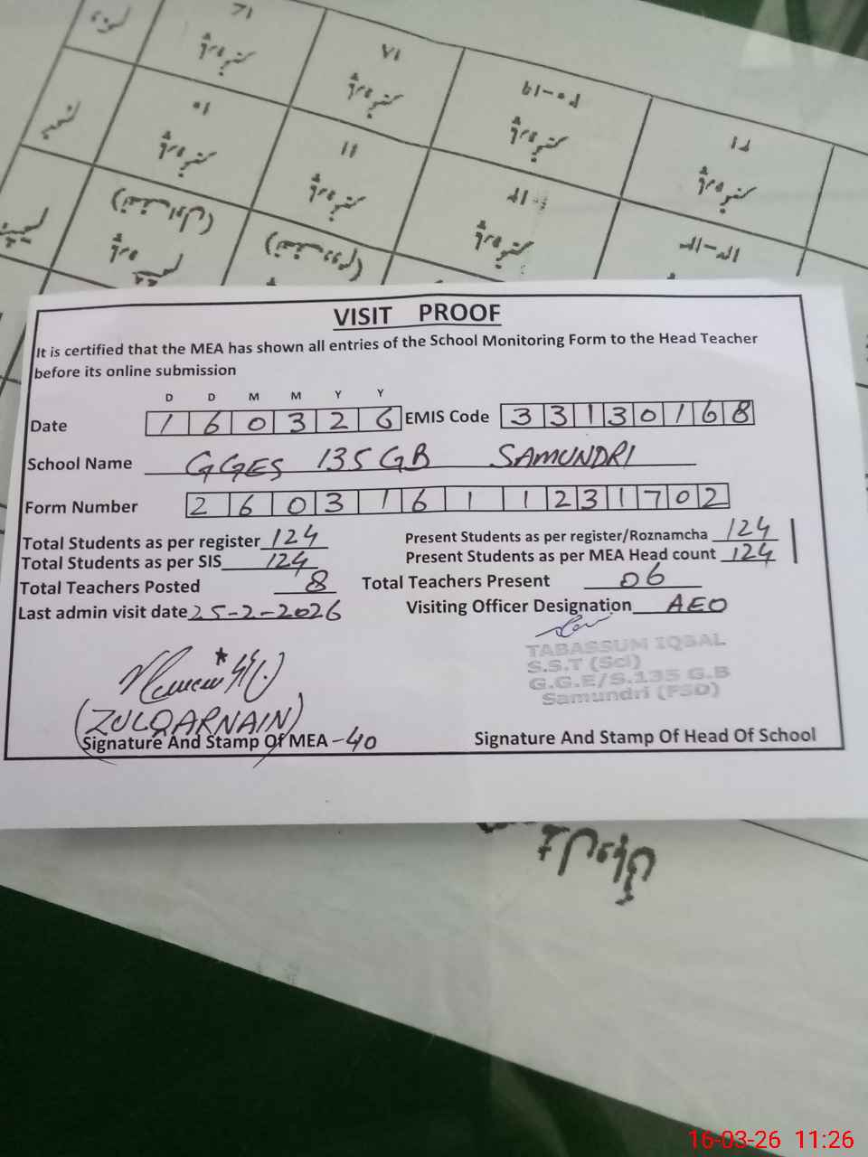 | Attendance Register | Head Teacher | MEA with School | Visit Proof |