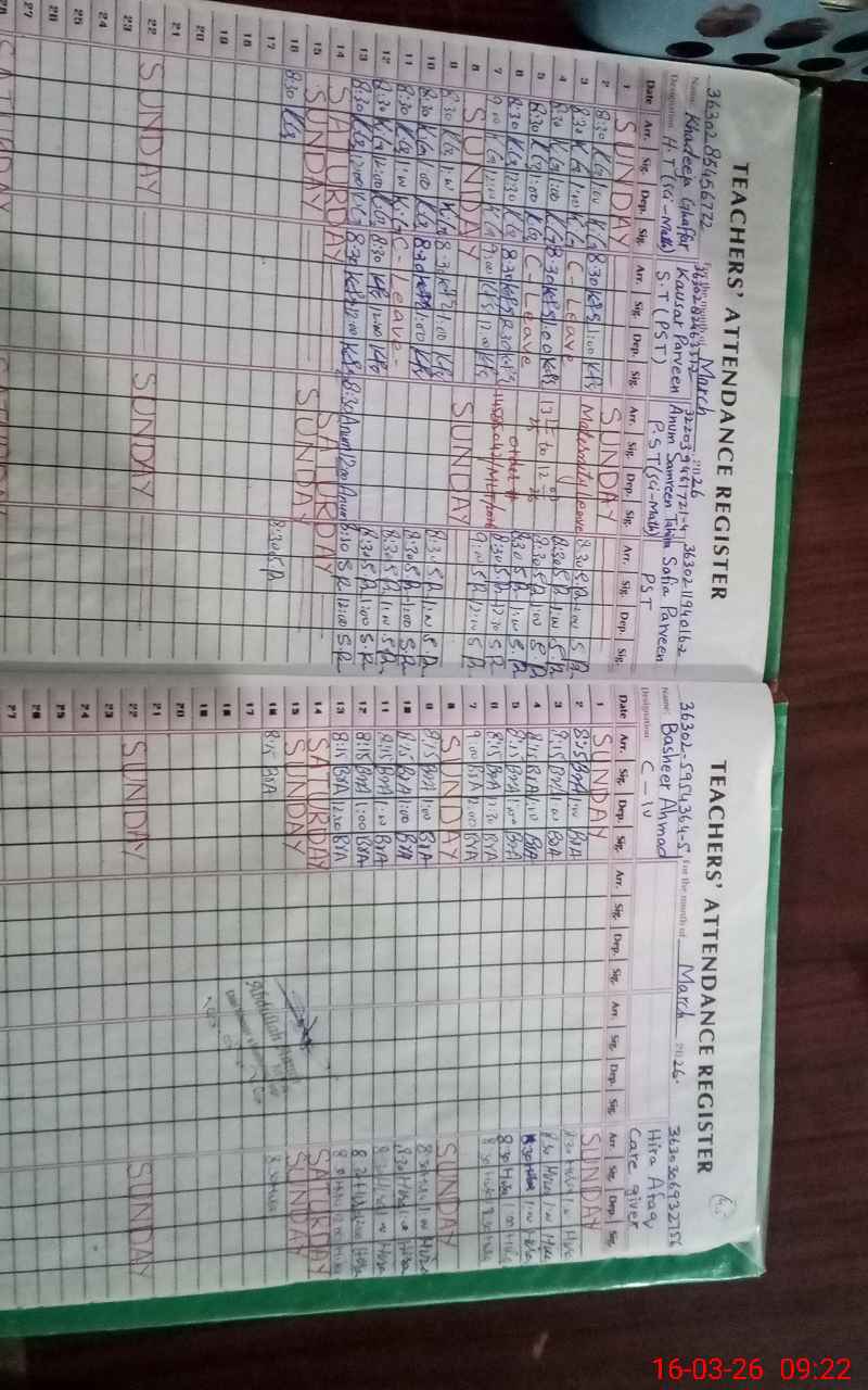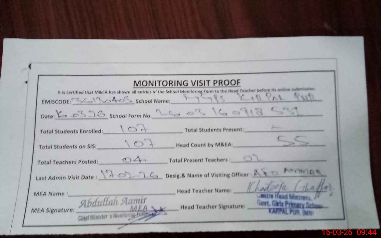 | Remarks (Use Separate Page if Required): Teacher kasur Parveen pst and Teachers Anum Samreen Pst came in school at 0925 hours so marked Absent. NSB not maintained and not provided Ece and Nursery classes are rest of exam today | |||||