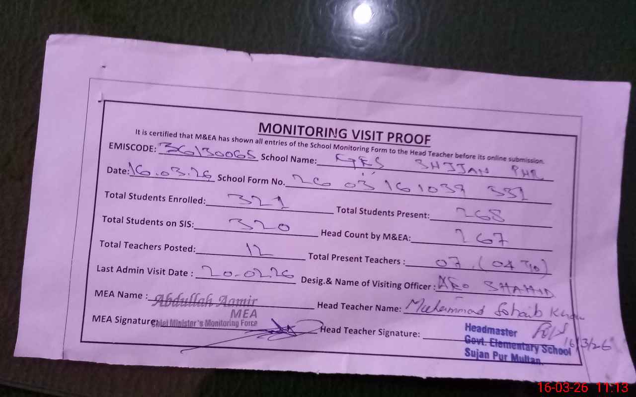 | EMIS Code: 36130065 | Name of School: GES SUJANPUR P/O BOHAR VIA TATAY PUR MULTAN | |||