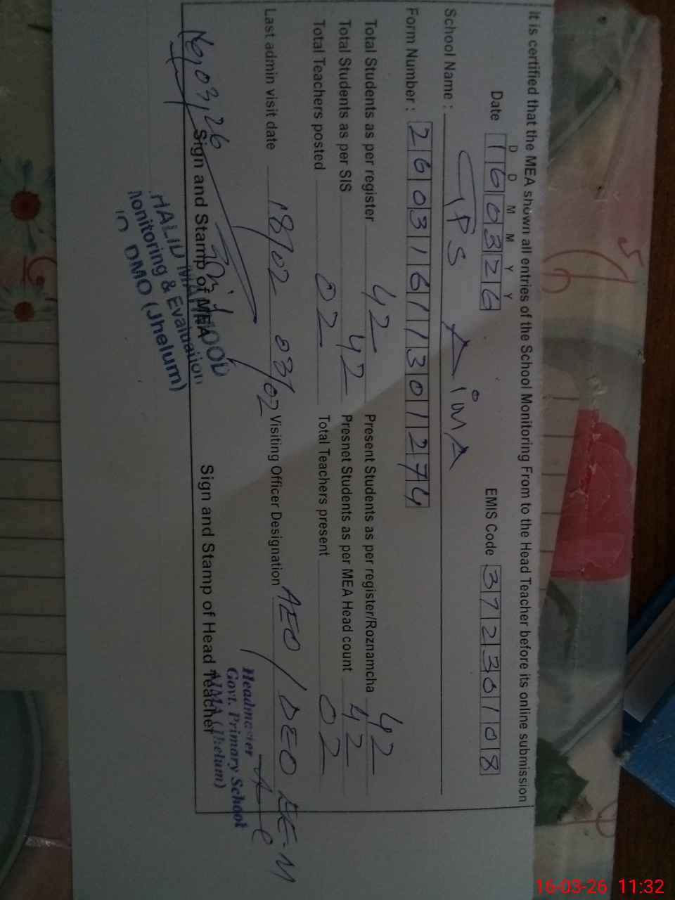 | Certified that this School was Inspected by the Undersigned MEA/DMO Today and the Information Stated Above is as Per Record. | |||||