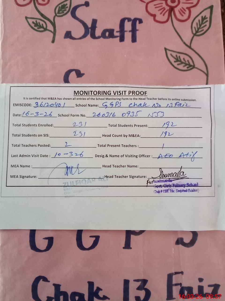 | Attendance Register | Head Teacher | MEA with School | Visit Proof |