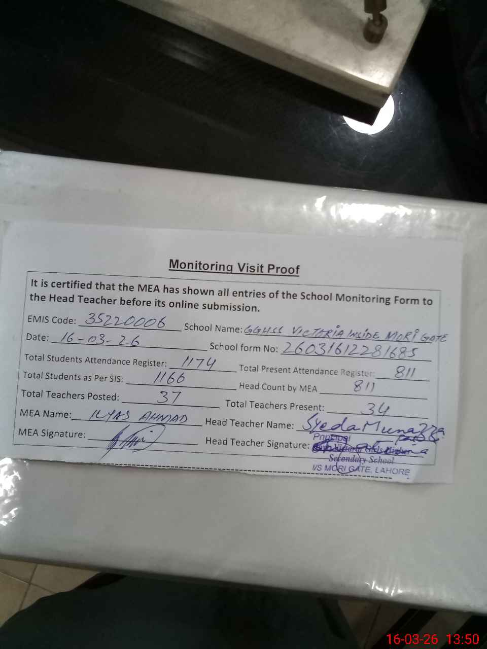 | Attendance Register | Head Teacher | MEA with School | Visit Proof |