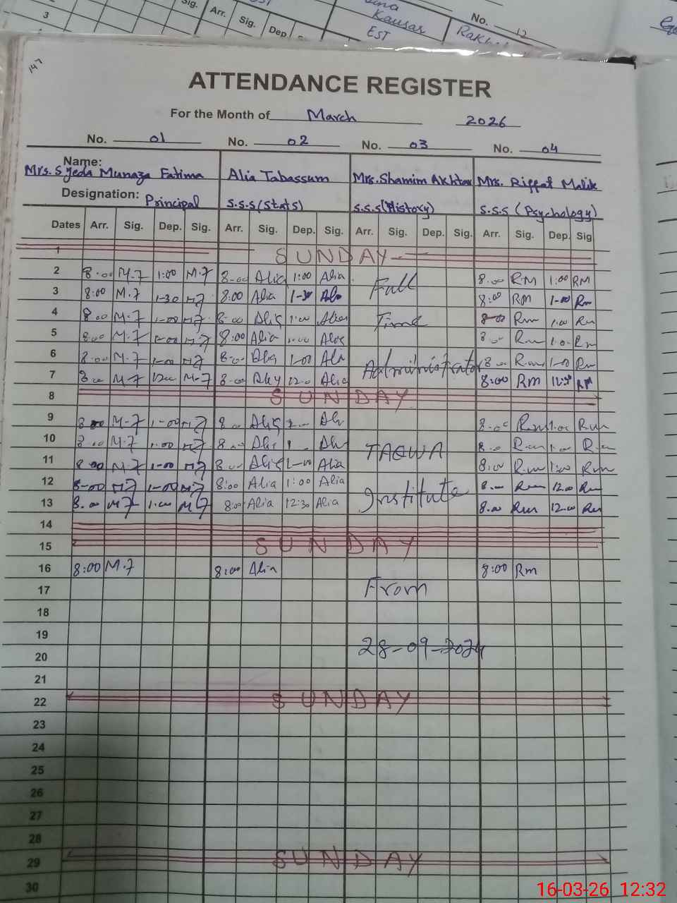 | Remarks (Use Separate Page if Required): Muhammad Shoib Chowkidar is marked absent today as attachment Orders are from 5 December 2025 to 3 March 2026 for 89 days 1st year and 2nd year classes off today On line class from home | |||||