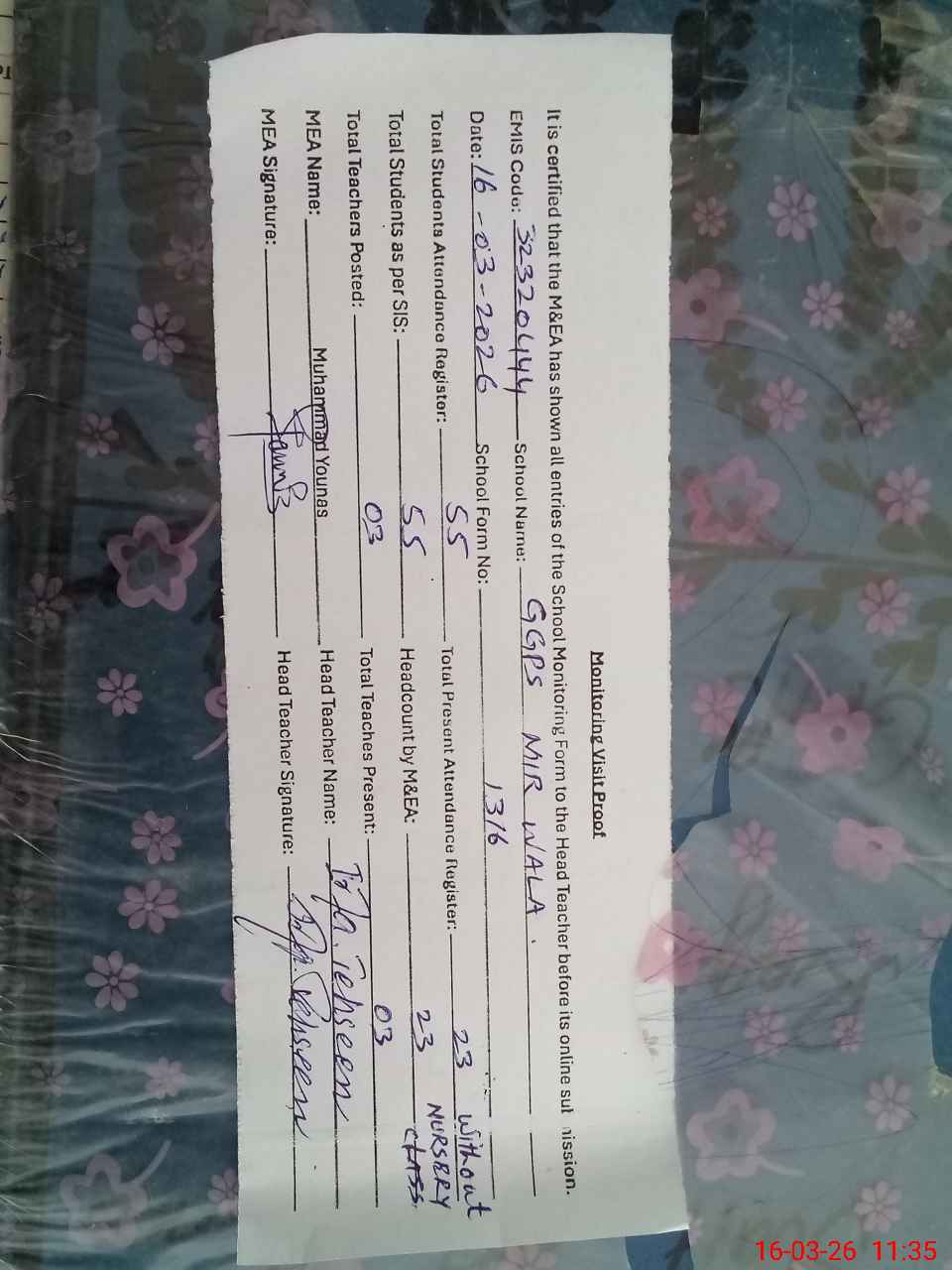 | EMIS Code: 32320444 | Name of School: GGPS MIR WALA | |||