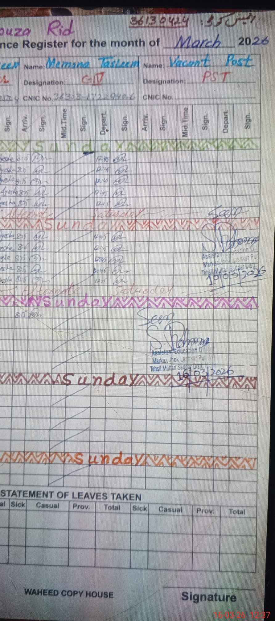 | CNIC | Full Name | Designation | R/C | Absence During Last Calender Month |