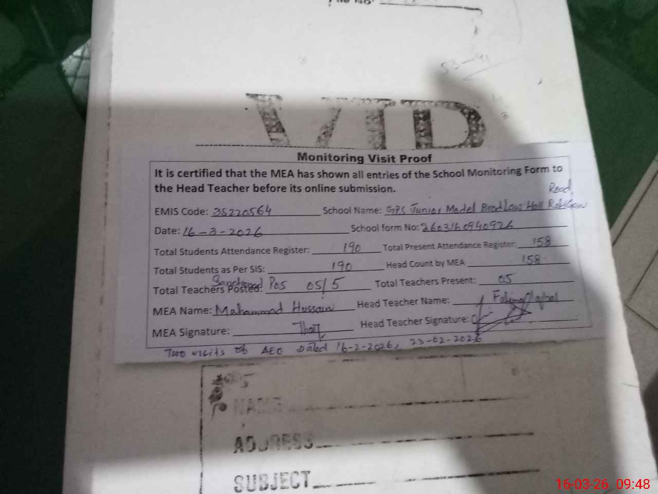 | EMIS Code: 35220564 | Name of School: GPS JUNIOR MODEL BRADLAUGH HALL RATIGAN ROAD (EX-MCL) | |||