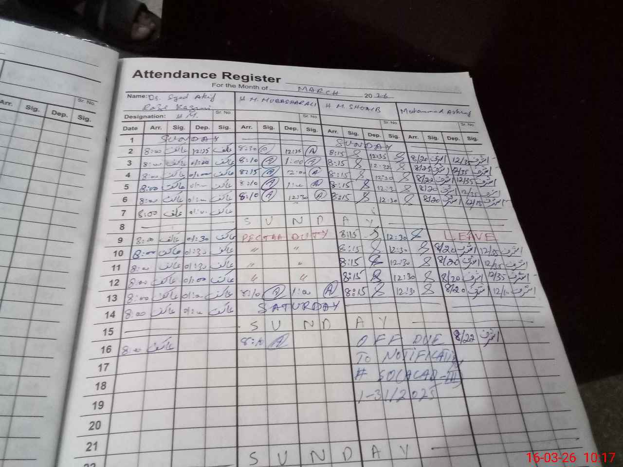 | CNIC | Full Name | Designation | R/C | Absence During Last Calender Month |