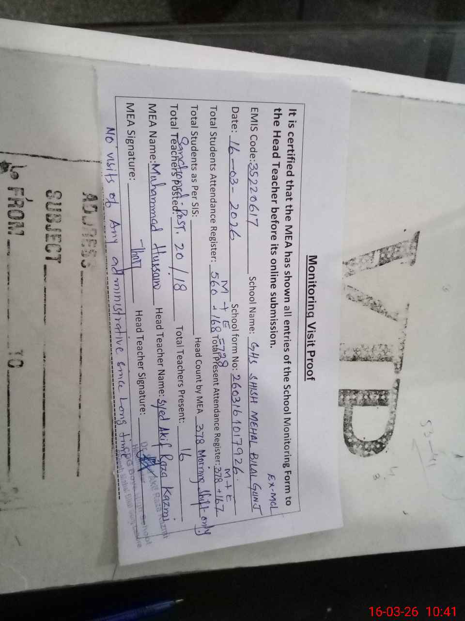 | Attendance Register | Head Teacher | MEA with School | Visit Proof |