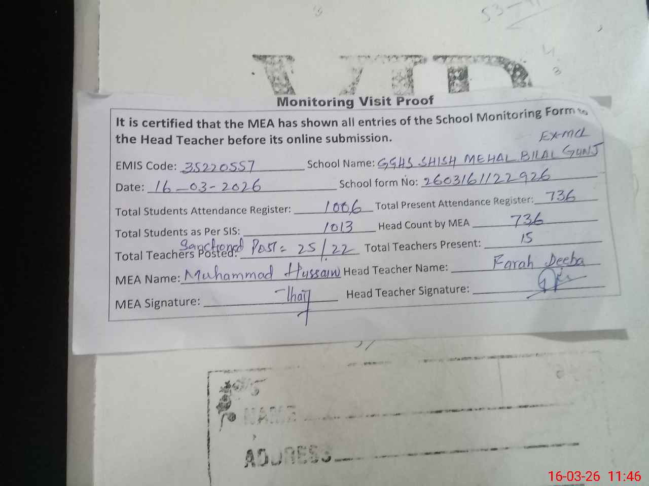 | Attendance Register | Head Teacher | MEA with School | Visit Proof |