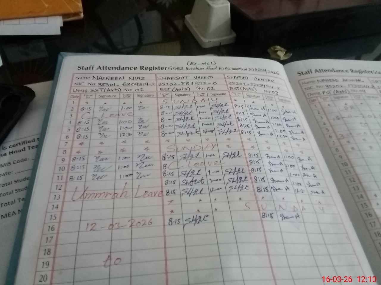 | CNIC | Full Name | Designation | R/C | Absence During Last Calender Month |