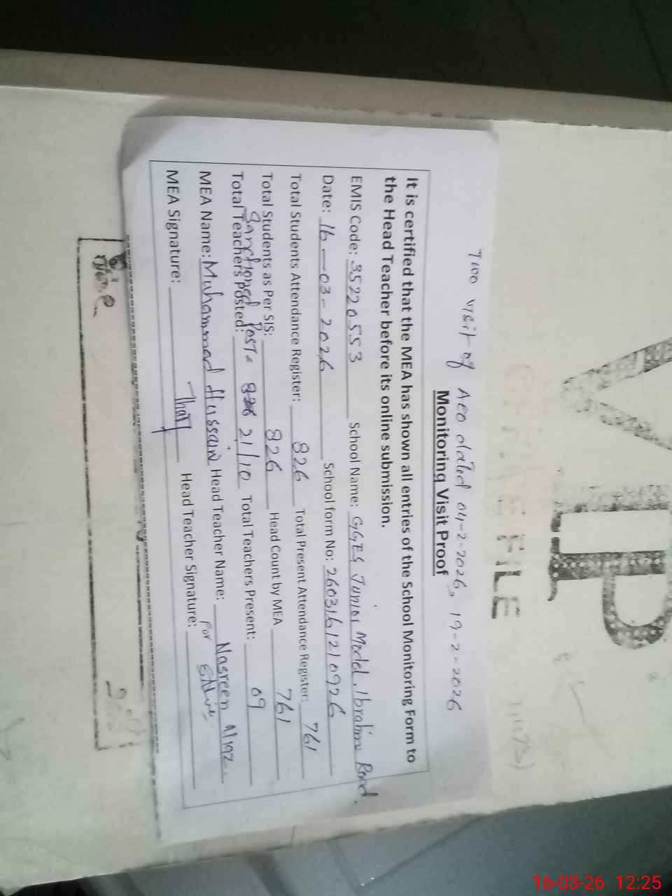 | Certified that this School was Inspected by the Undersigned MEA/DMO Today and the Information Stated Above is as Per Record. | |||||