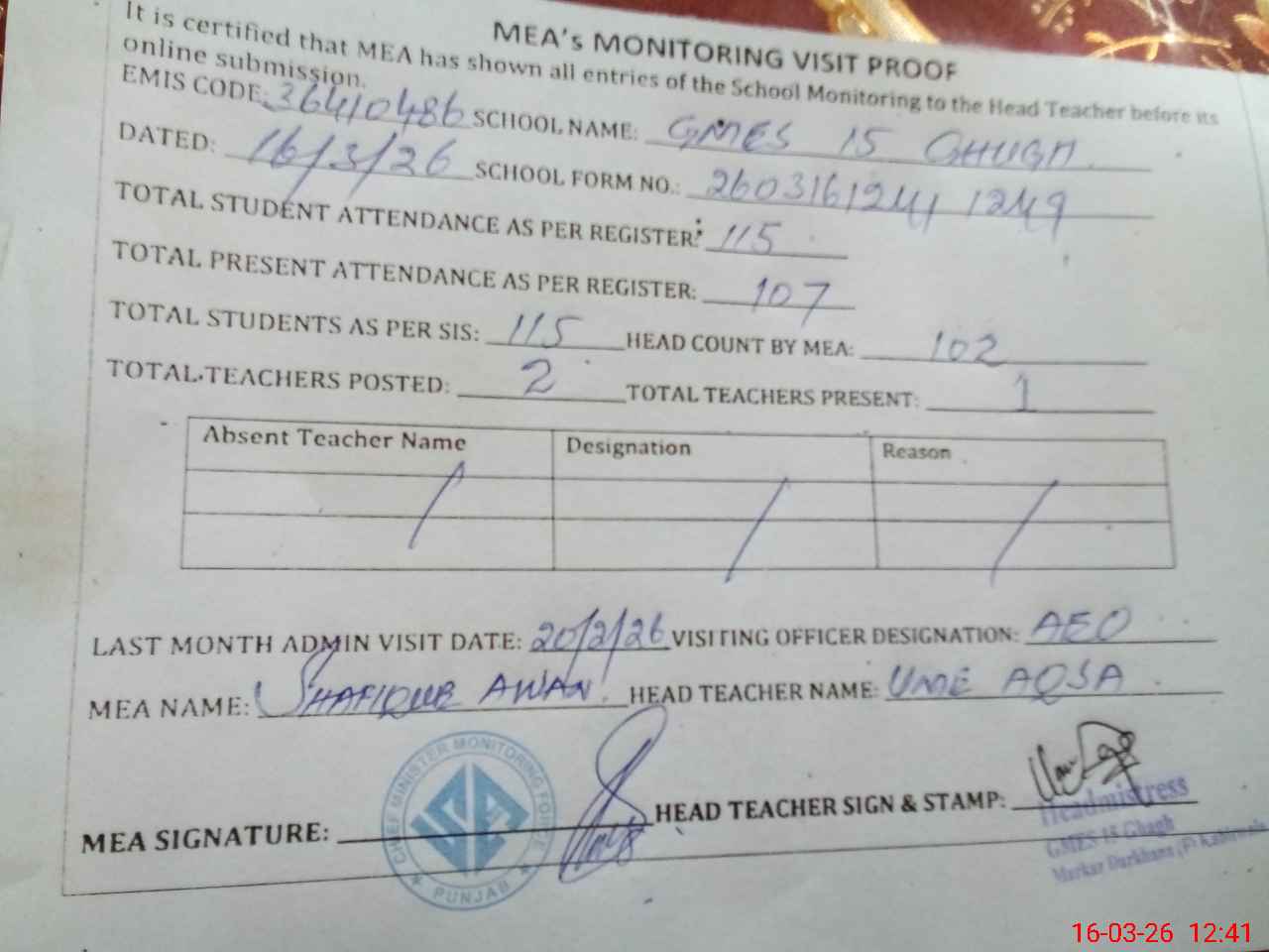| Attendance Register | Head Teacher | MEA with School | Visit Proof |