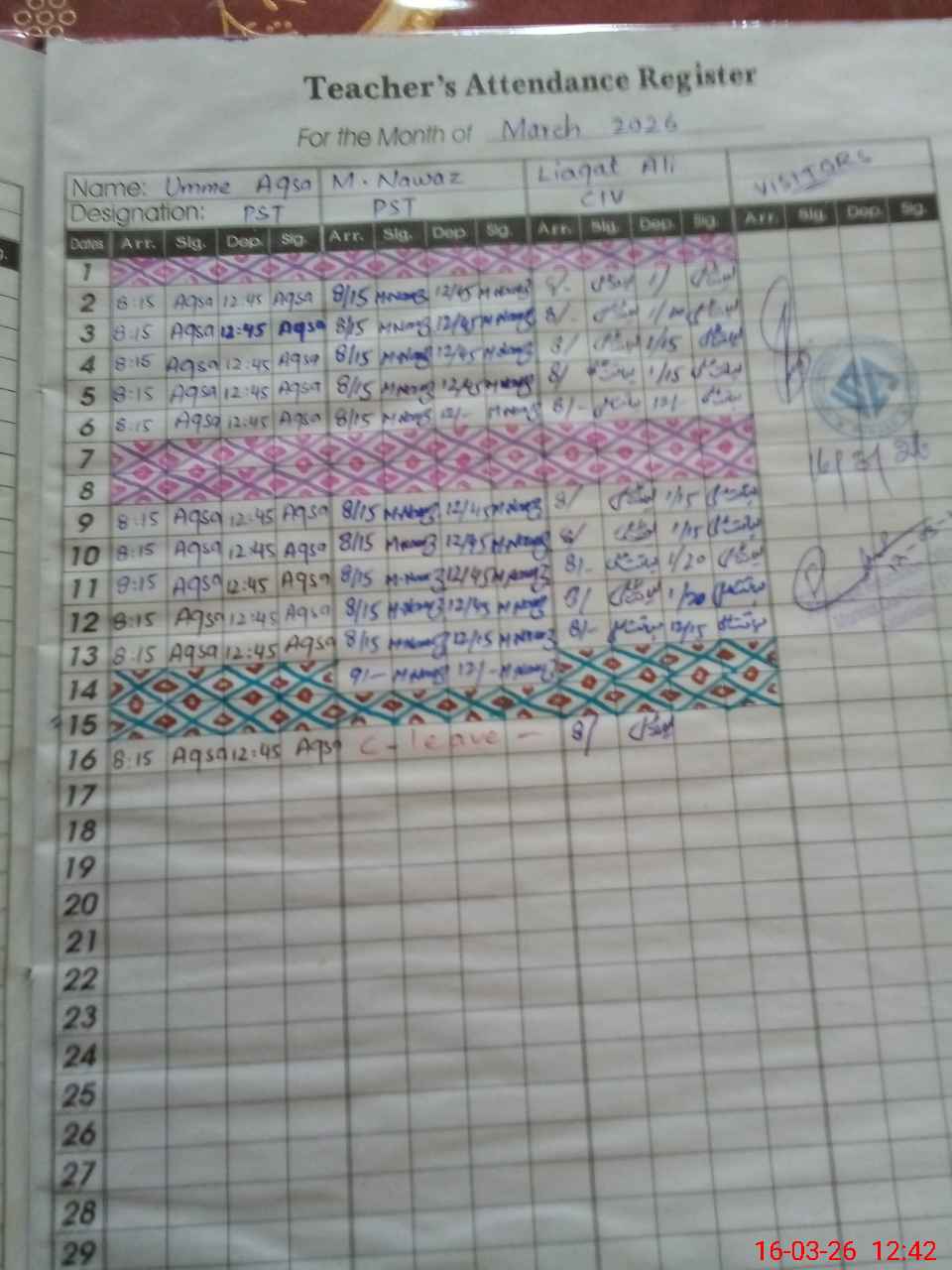 | CNIC | Full Name | Designation | R/C | Absence During Last Calender Month |