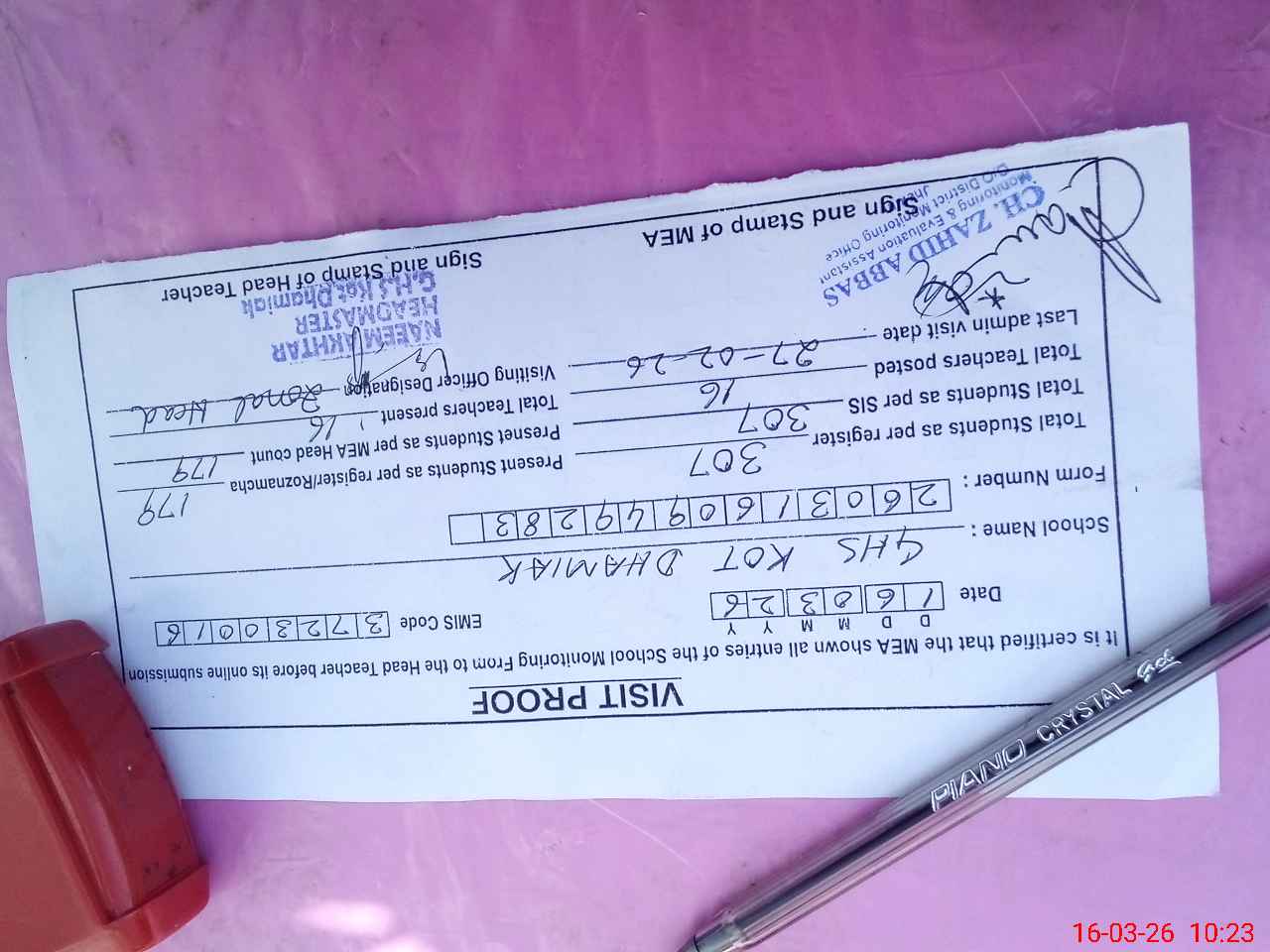 | Certified that this School was Inspected by the Undersigned MEA/DMO Today and the Information Stated Above is as Per Record. | |||||