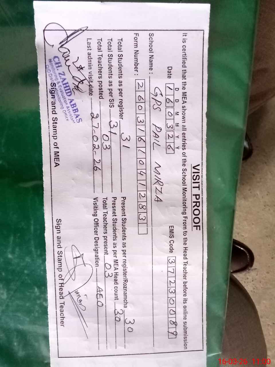 | Attendance Register | Head Teacher | MEA with School | Visit Proof |