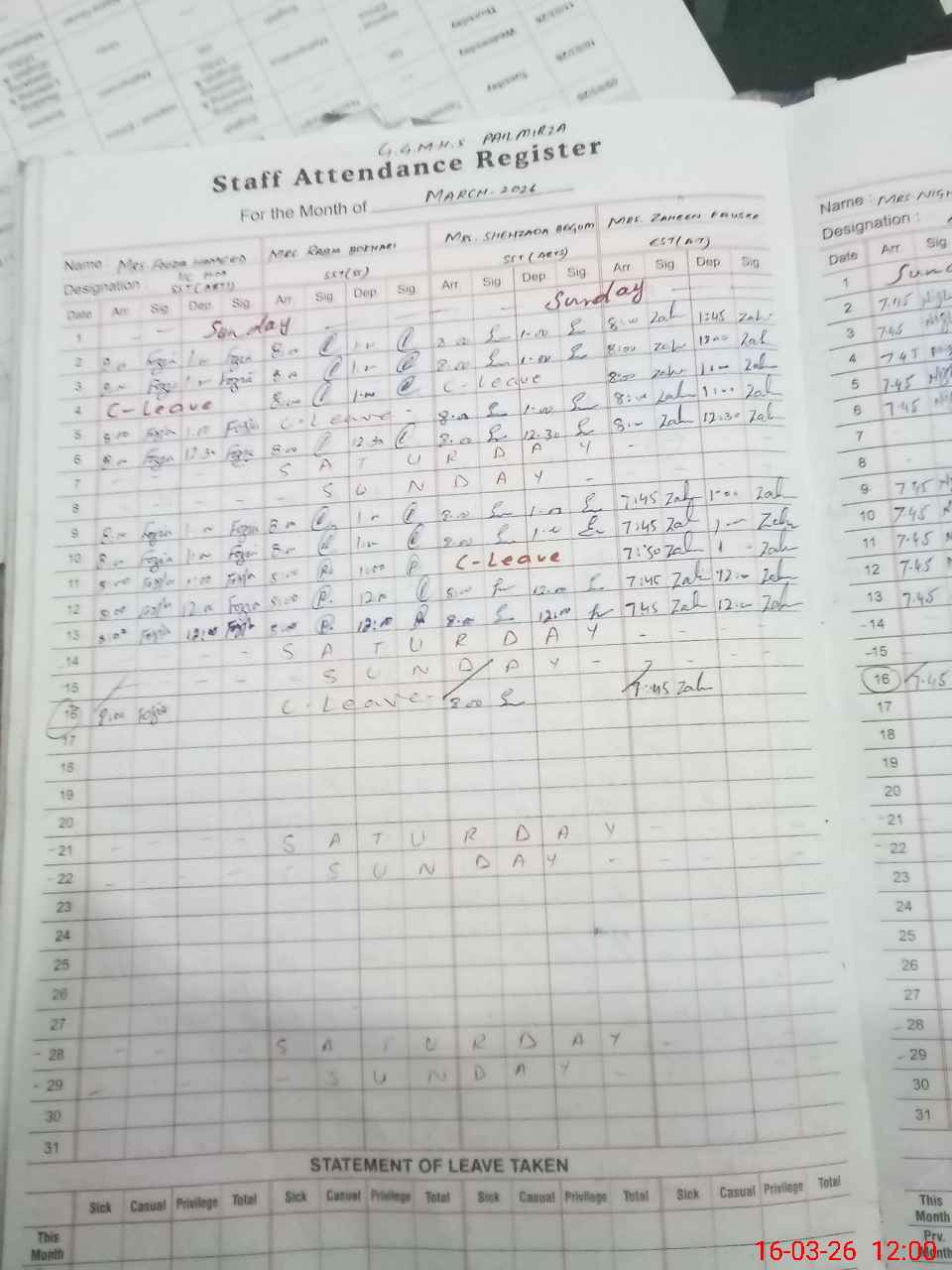 | Leave | Duty | Absent | Maternity | Medical | Ex- Pak |