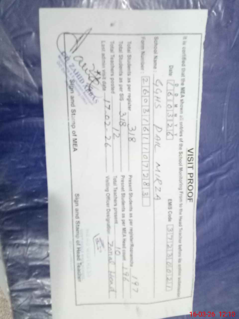 | Attendance Register | Head Teacher | MEA with School | Visit Proof |