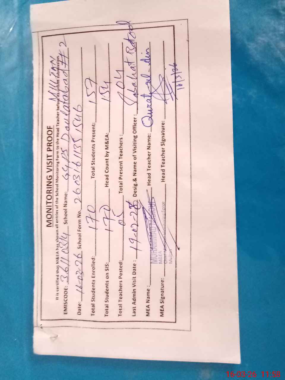 | EMIS Code: 36110314 | Name of School: GGPS DAULAT ABAD NO.2 MULTAN | |||