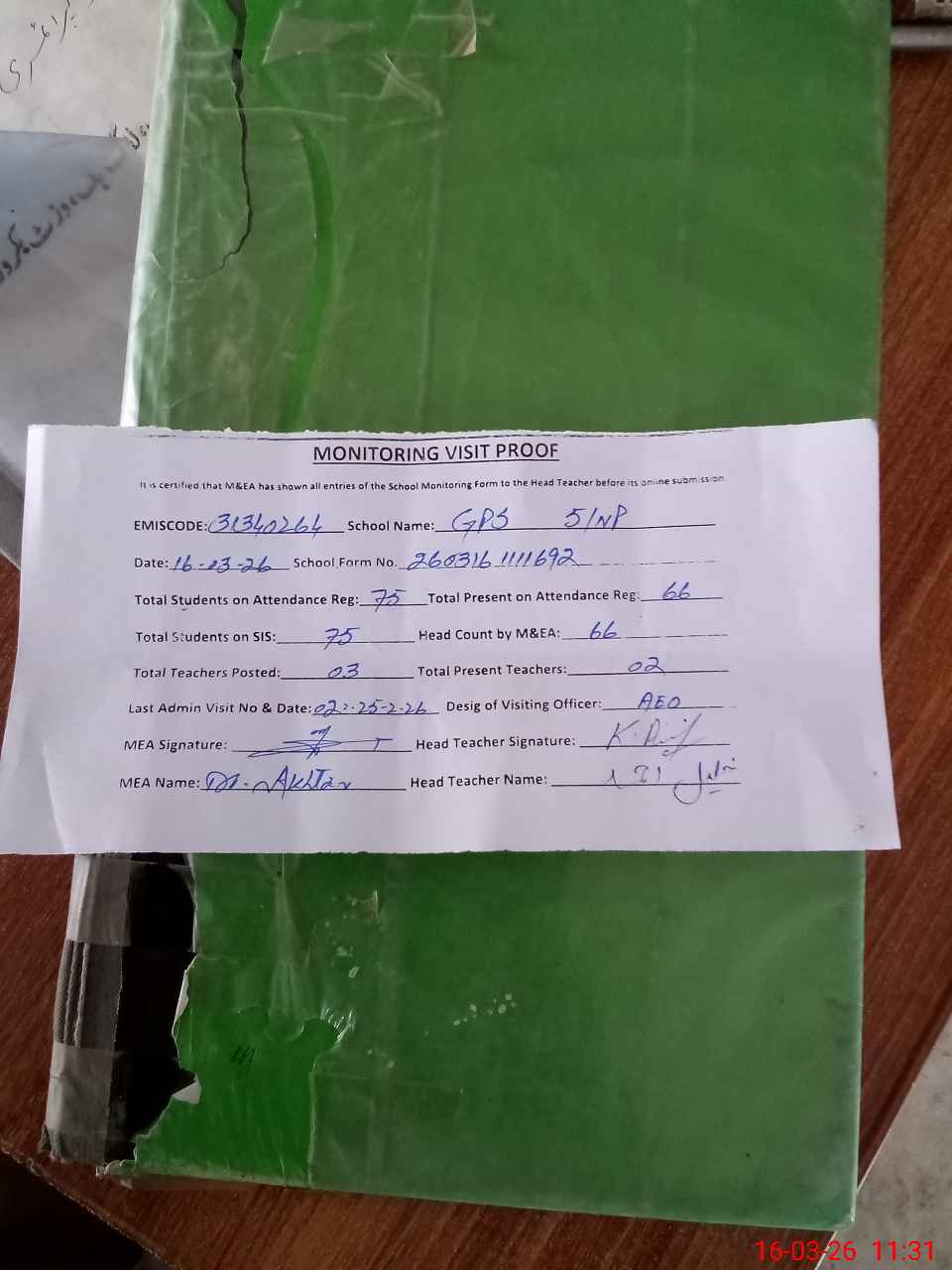 | Attendance Register | Head Teacher | MEA with School | Visit Proof |