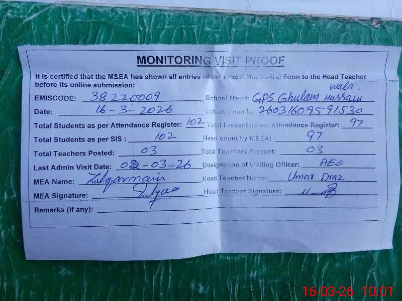 | EMIS Code: 38220009 | Name of School: GPS GHULAM HUSSAIN WALA | |||
