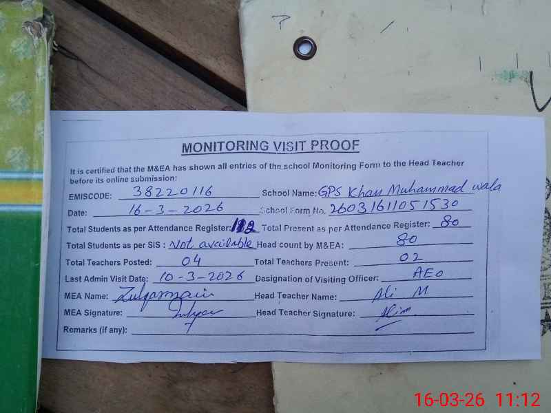 | EMIS Code: 38220116 | Name of School: GPS KHAN MUHAMMAD WALA | |||