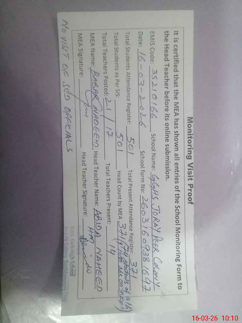 | EMIS Code: 35210166 | Name of School: GGHS JORAY PEER COLONY BAGHBAN PURA | |||