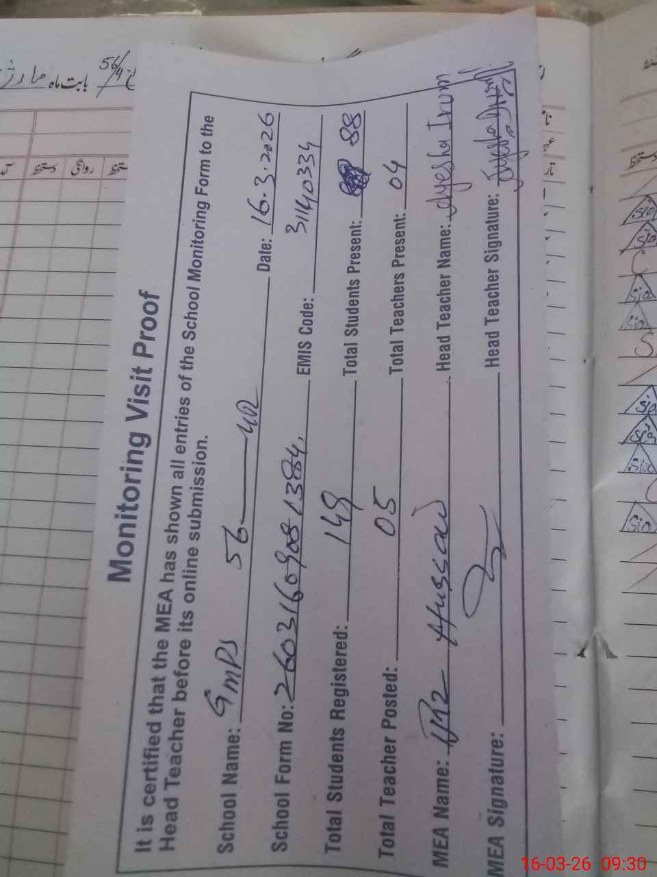 | Attendance Register | Head Teacher | MEA with School | Visit Proof |