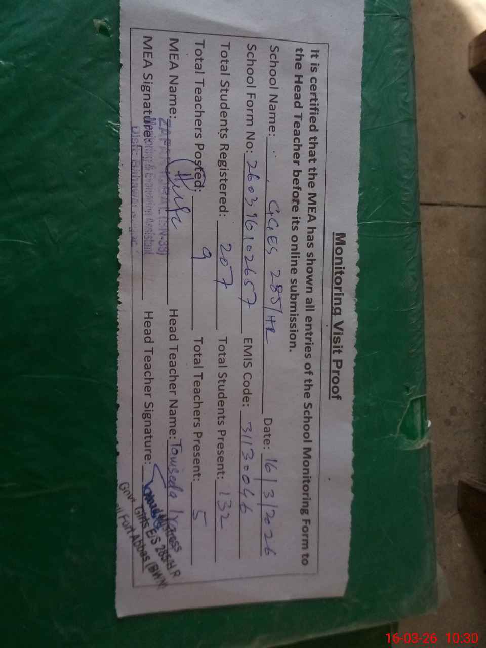 | EMIS Code: 31130046 | Name of School: GGES CHAK 285/HR | |||