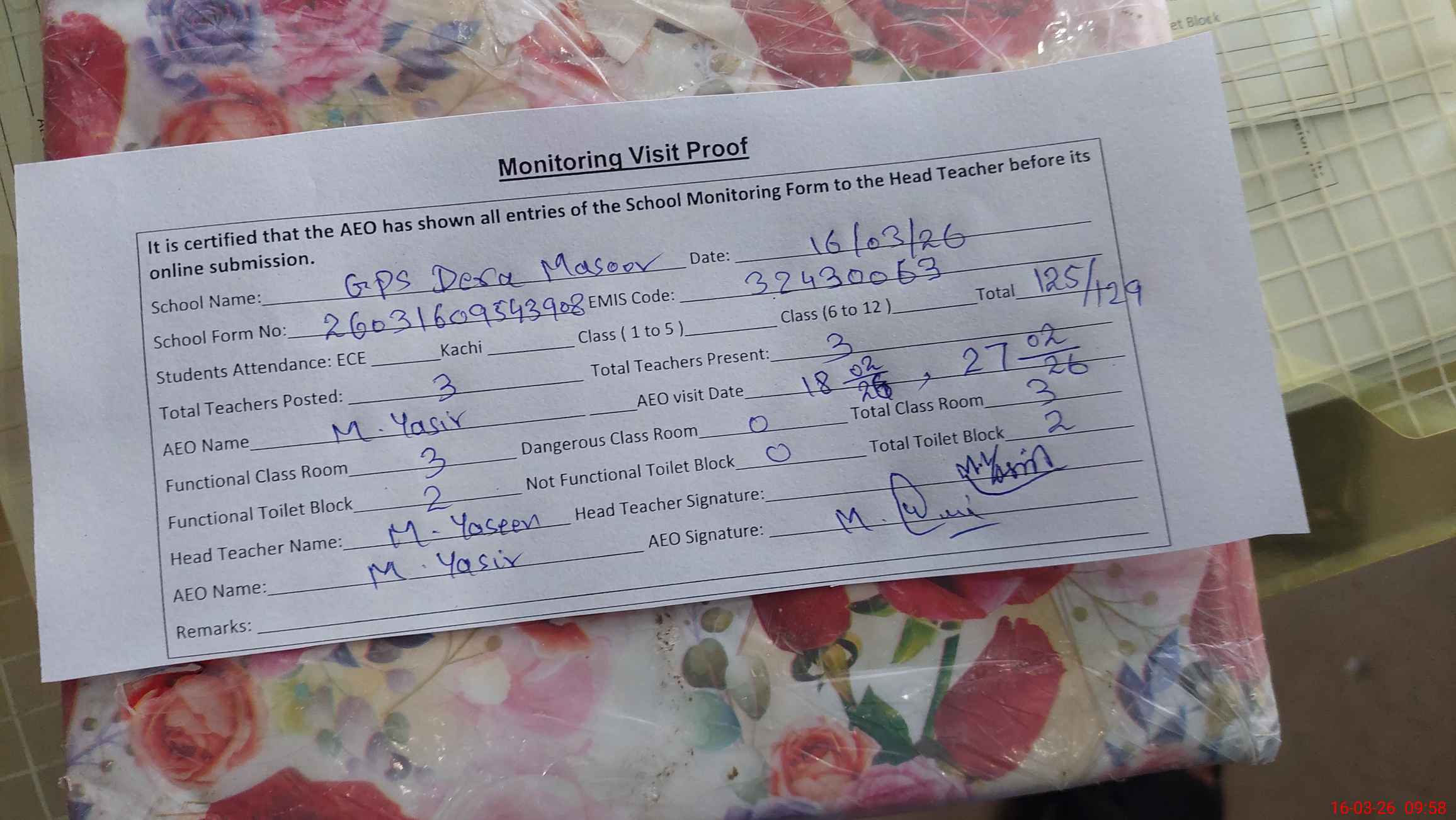 | EMIS Code: 32430063 | Name of School: GPS DERA MASOOR | |||