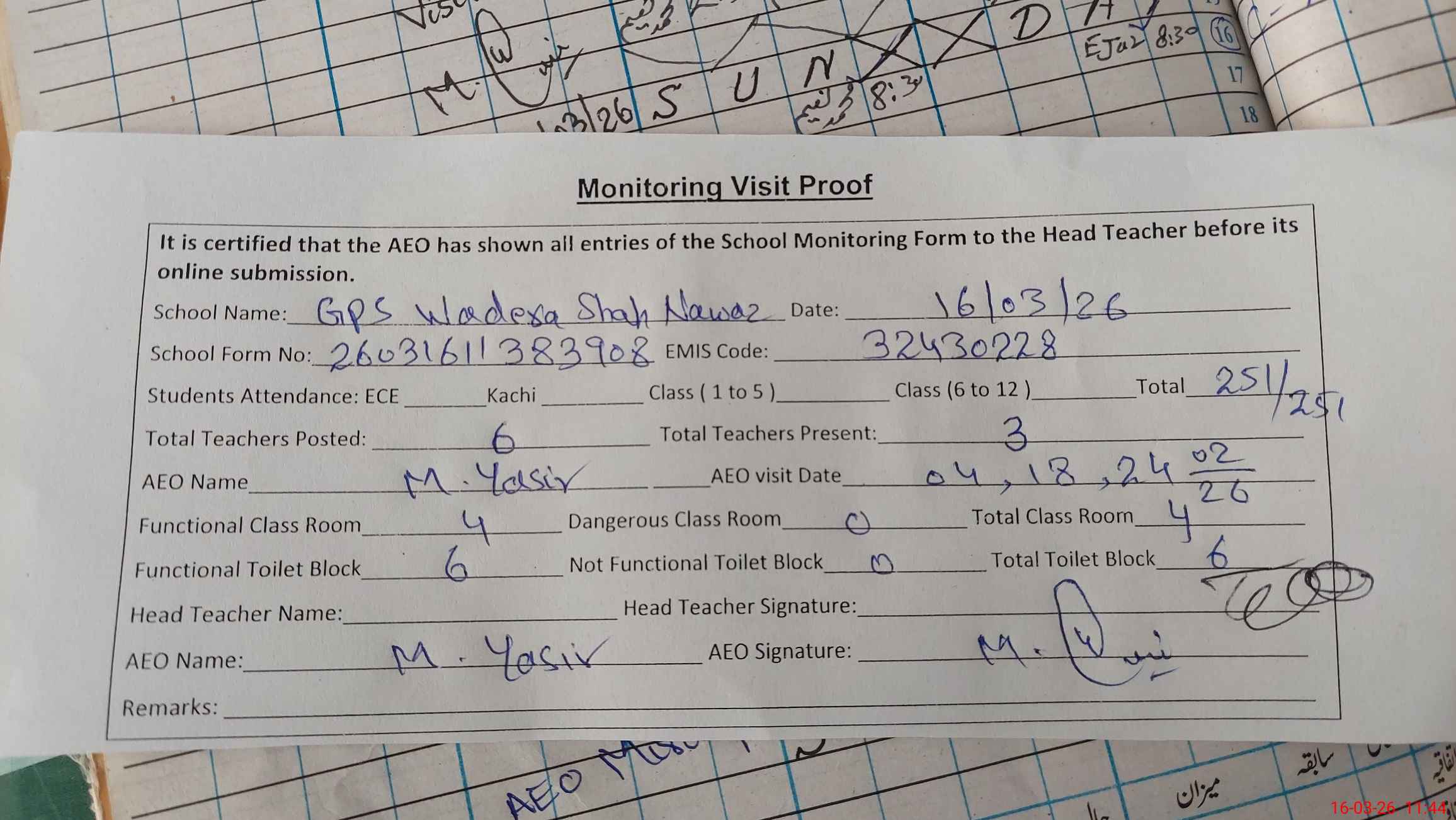 | Attendance Register | Head Teacher | MEA with School | Visit Proof |